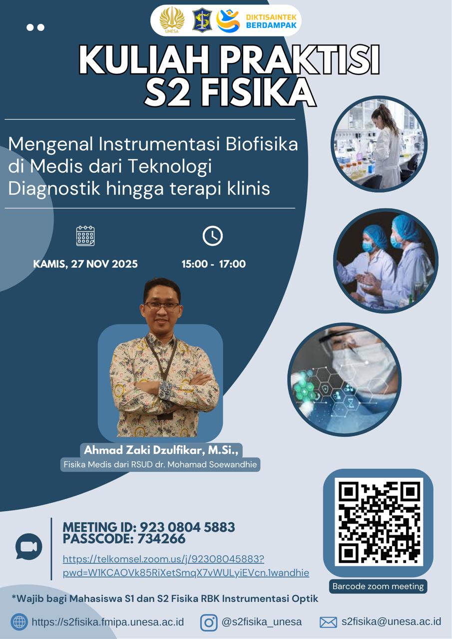 Program Studi S2 Fisika Universitas Negeri Surabaya (UNESA) menyelenggarakan Kuliah Praktisi bertema “Mengenal Instrumentasi Biofisika di Medis dar